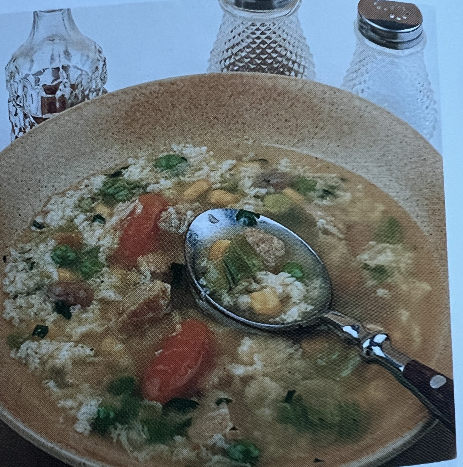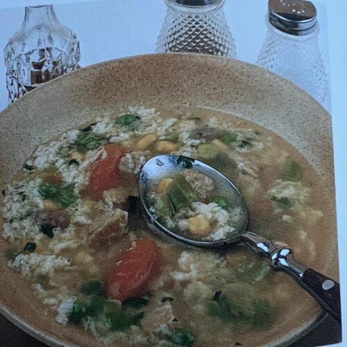 - Pridajte uvarenú ryžu , mrazenú zeleninu a varte , kým zelenina nezmäkne.