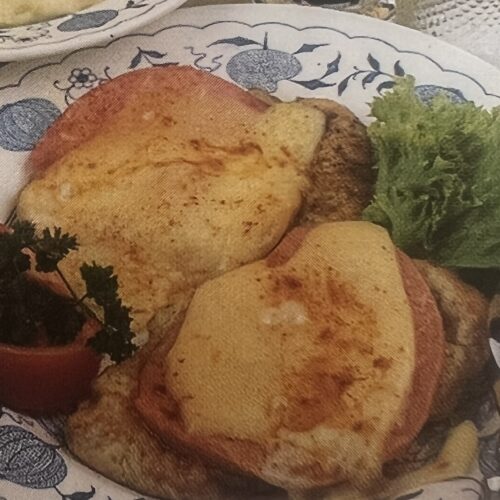 - Na každý rezeň položíme plátok šunky a plátok syra potom vrch posypeme paprikou a už len dáme zapiecť.